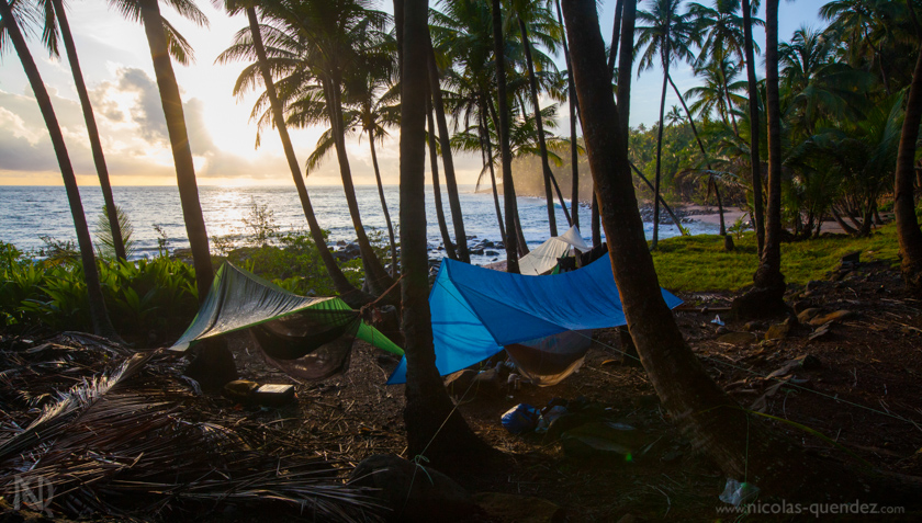 Finalement, après 12 heures passées en mer (65 km à la rame, un peu plus de 10 heures effectives à pagayer), nous débarquons sur l’île St Joseph (une des trois îles du salut) et sa plage paradisiaque, au coucher du soleil. Il faut viser juste, il y a des rochers partout, et les déferlantes sont importantes : concentrations de rigueur pour cette arrivée technique… Mais l’objectif est atteint !