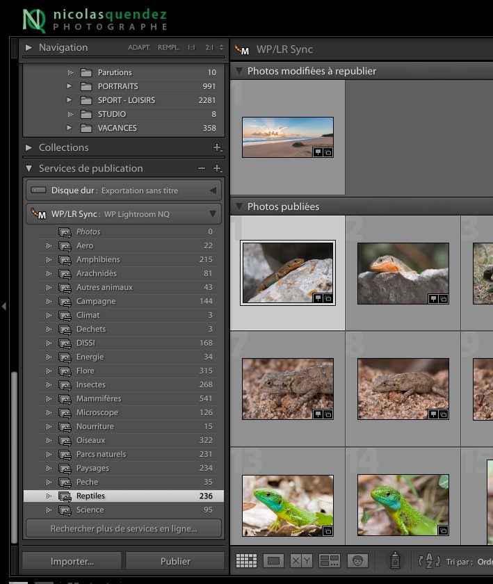 Exemple : ma collection « Reptiles » est synchronisée. Sous Lightroom je vois que j’ai une photographie modifiée à re-publier, il suffit que je clique sur « publier » pour qu’elle se re-synchronise.