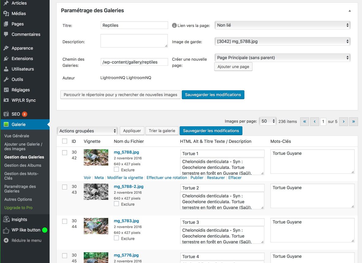 Sous WordPress, ma galerie sous NGG est donc synchronisée en permanence avec ma collection Lightroom. Les galeries sont créées automatiquement (ex : Reptiles), puis mises à jour de manière autonome :